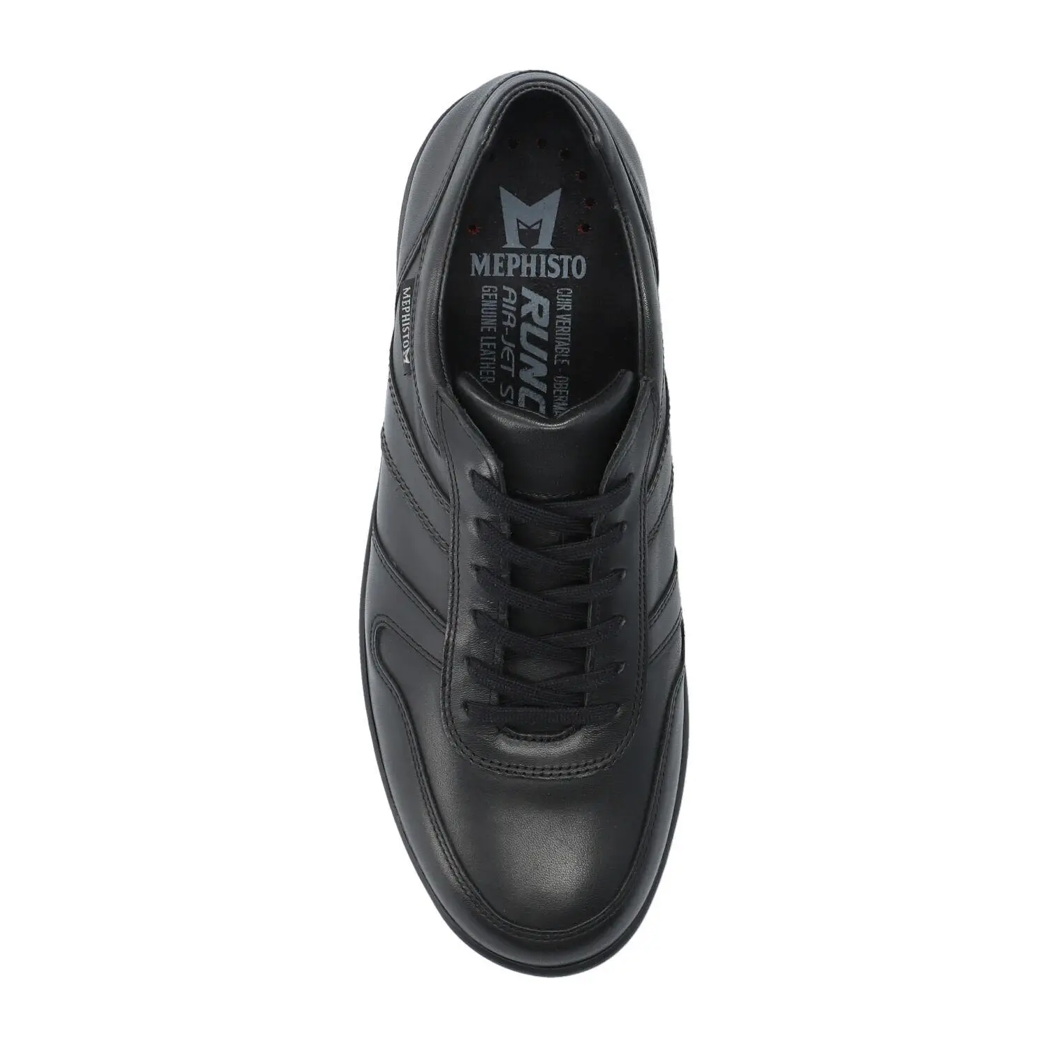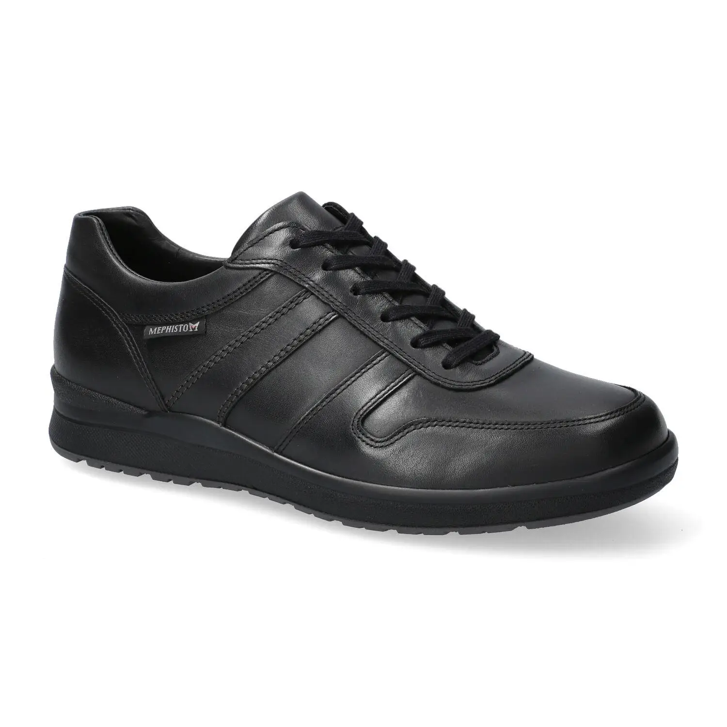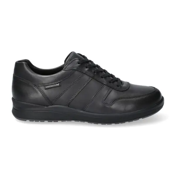 VITO van MEPHISTO: Deze aangenaam comfortabele schoen gaat overal met je mee, of je nu de stad in gaat, een wandeling in het park maakt of naar het theater gaat. Deze zwarte herensneaker is gemaakt van glad leer.
